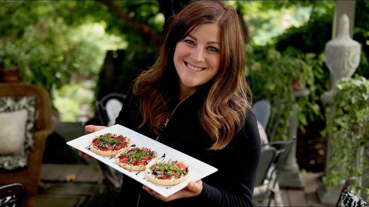 To assemble, fill each tartlet shell with a layer of the cheese mixture, top with sliced tomatoes and julienned basil, then drizzle them with the balsamic glaze.