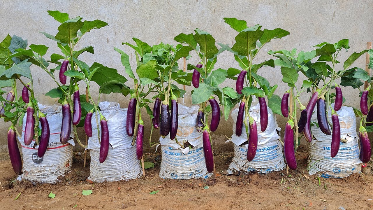 Superb planting method of having healthy vegetables and fruits growing eggplants in the garden.