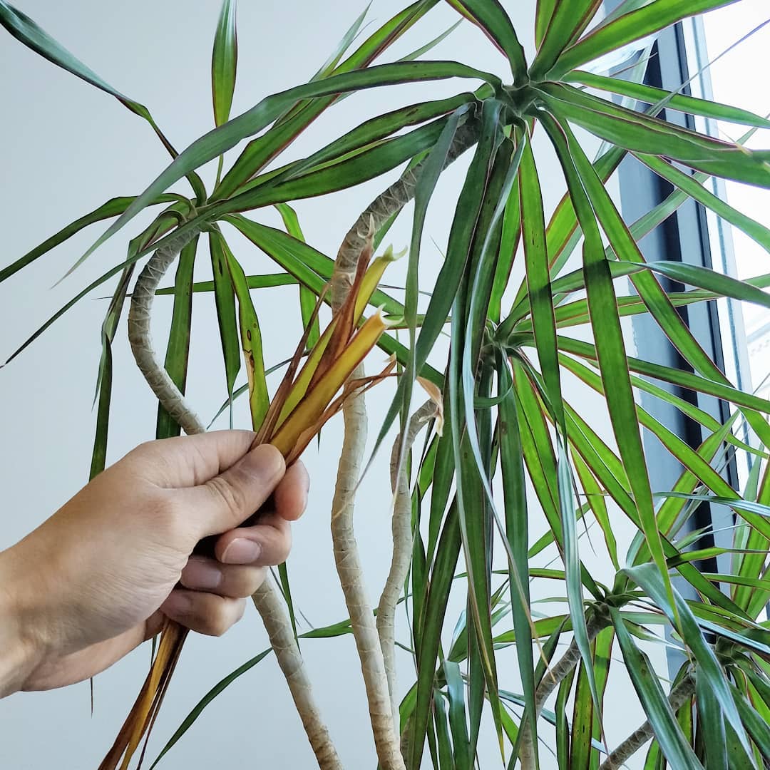 First, look at all these older leaves I pulled off from my Dracaena marginata and notice that each of these lines on the trunk represents a fallen leaf.
