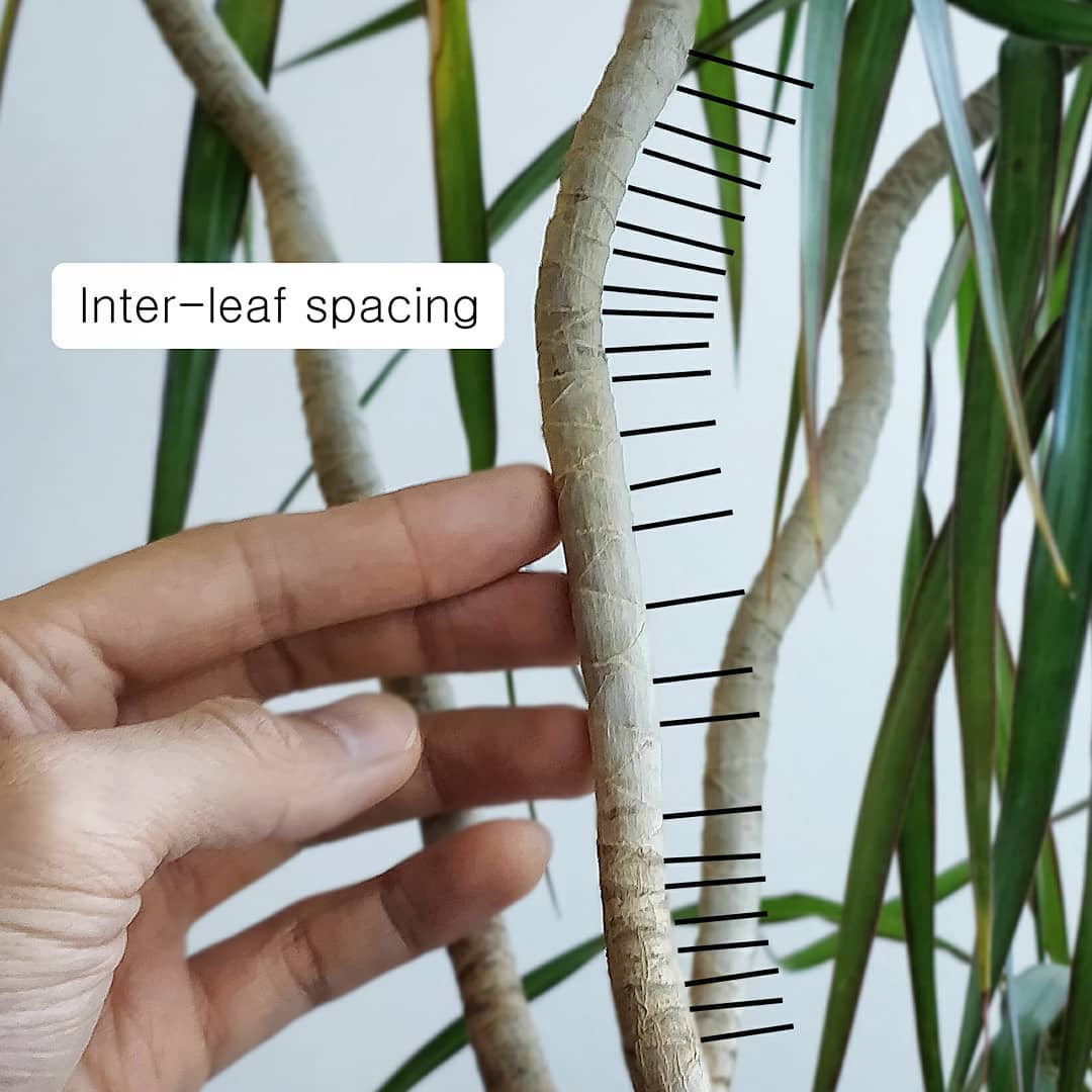 📷 2) Now for the fascinating part: the spacing between the scars was farther apart in this lower section. By doing a (very) rough calculation of the average leaf drop rate, this widely spaced section was the top of the plant 3 years ago. Here’s what I think happened – we moved into this office around that time and put the plant here in this bright window. In our old office, the plant was being used as a typical office plant in a sitting area far from any windows. Thus, during that time, the growing tip was stretching out for more light. So the trunk of the Dracaena can give you clues about its past conditions!