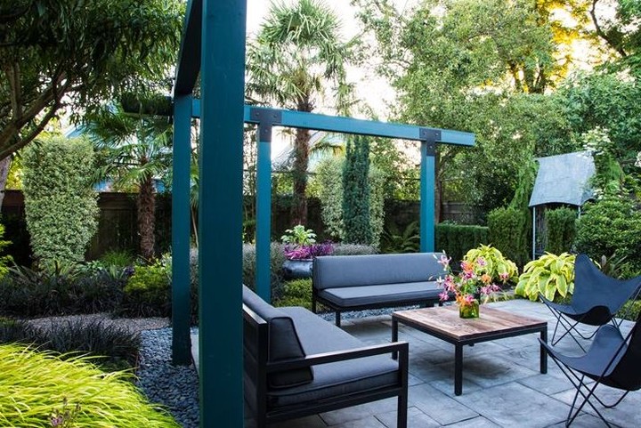 An inviting patio outside garden designer Lauren Hall-Behrens’ back door is surfaced with concrete pavers. Sleek, comfy couches she designed using black powder-coated aluminum and cushions covered with Sunbrella fabric in canvas coal furnish the space. The arbor-like structure outlines the patio, extending the home’s architecture into the garden. Photo by @clairetakacs.
