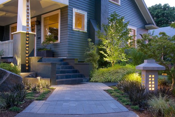 Pictured: Entry lighting includes fixtures along the sidewalk and uplighting on a fountain, rain chain, and small tree. The integration of different light sources results in a more sophisticated, pleasing effect. Design by David P. Best and Barbara Hilty. Photo by Janet Loughrey.