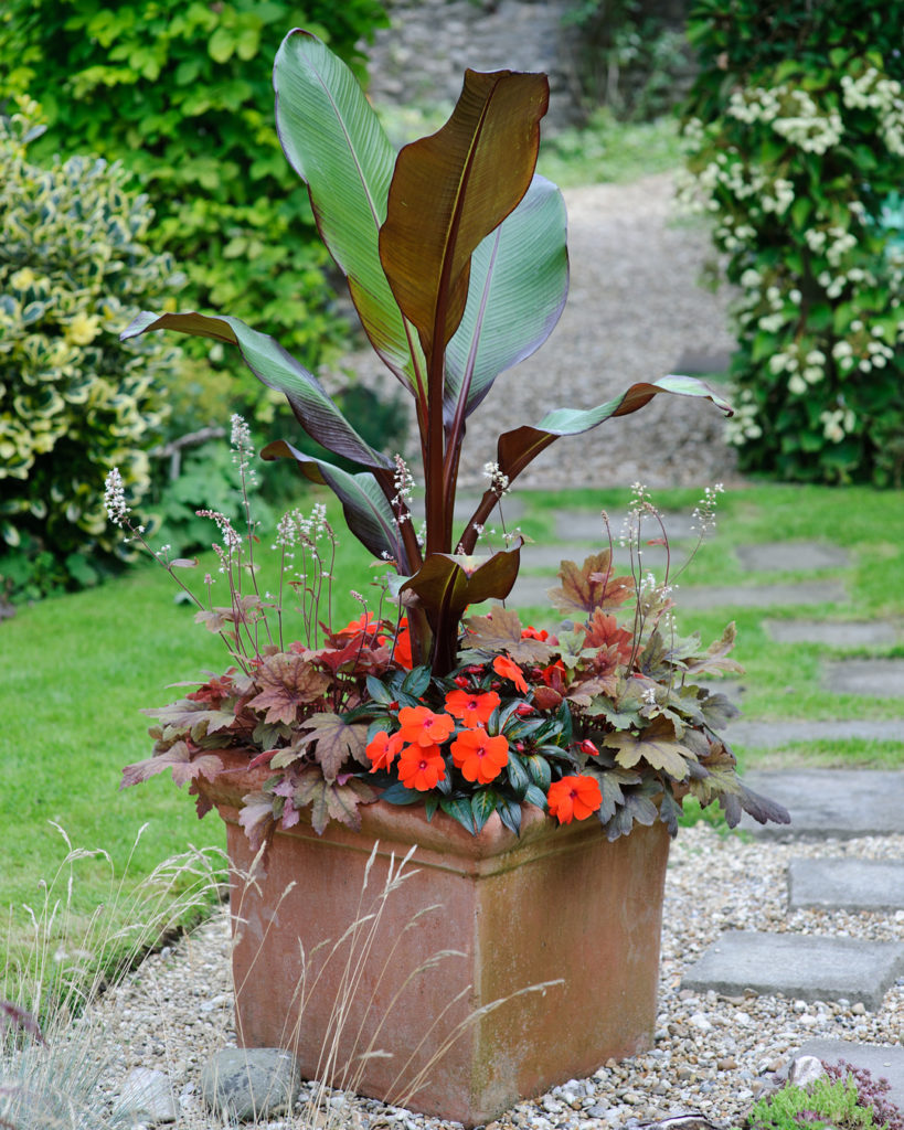 An exotic summer focal point planting for a warm, sunny spot, the banana dominates most anything you combine it with. The foliage of foamy bells (a hardy perennial) and the impatiens (an annual) echo the banana’s structure and color scheme. Foamy bells can probably do another year in a container or be planted in a lightly shaded garden area.
