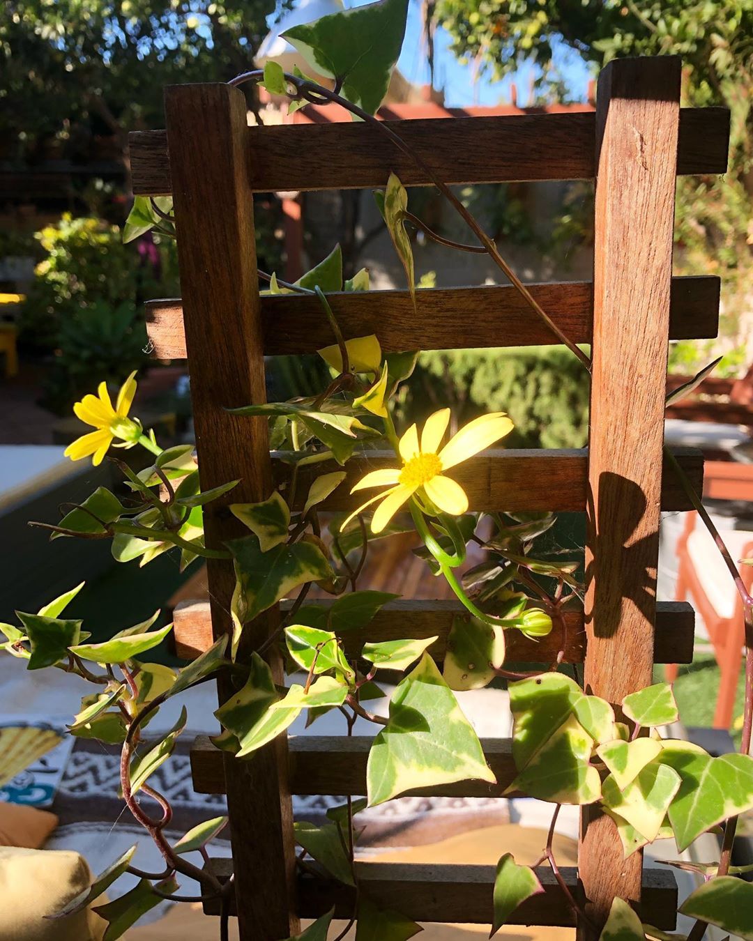 Variegated English ivy has a doppelgänger — introducing the variegated wax ivy (Senecio macroglossus ‘Variegatus’) and this one is a succulent! After a couple years in the garden it’s finally flowering! And those flowers should look like daisies because they’re in the same Asteraceae family 🌼🌵#seneciomacroglossusvariegatus #seneciomacroglossus #succulents #variegatedwaxivy