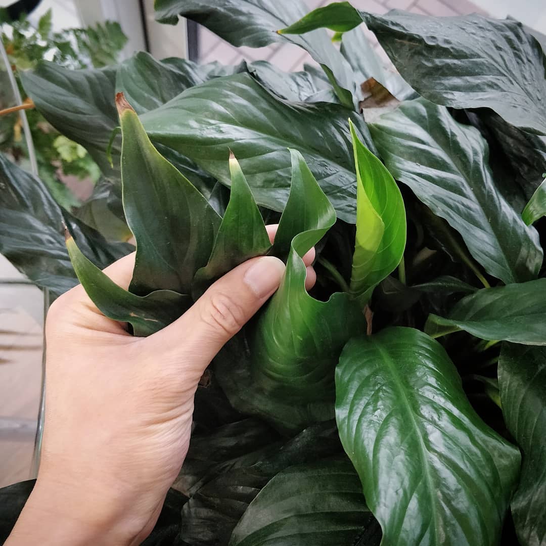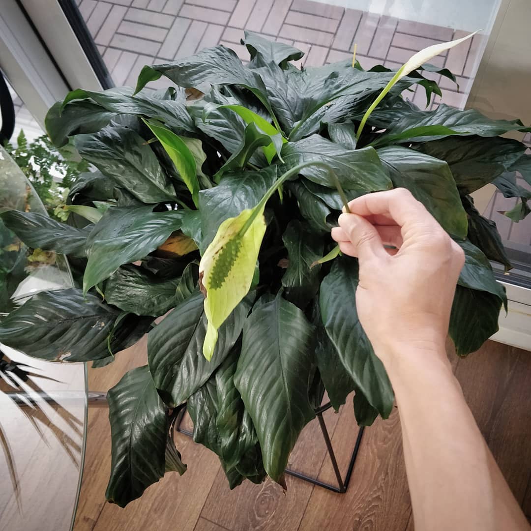 2️⃣ Given that my peace lily lives where it has the widest possible view of the sky (and it is sufficiently large), the watering strategy of “keep evenly moist” can be applied. My oldest leaves have an acceptable amount of browning while I enjoy the pristine newest leaves.