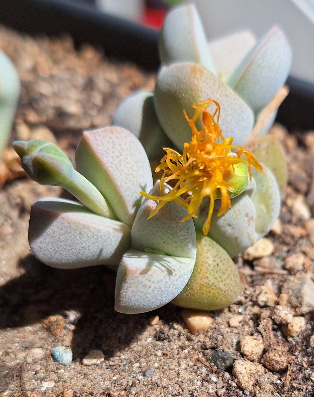 I’ve posted about this Dinteranthus of mine before, but felt this achievement deserved a record. Despite not watering it for months now (to correct it’s stacking), it’s gone and produced a flower bud from every single head!