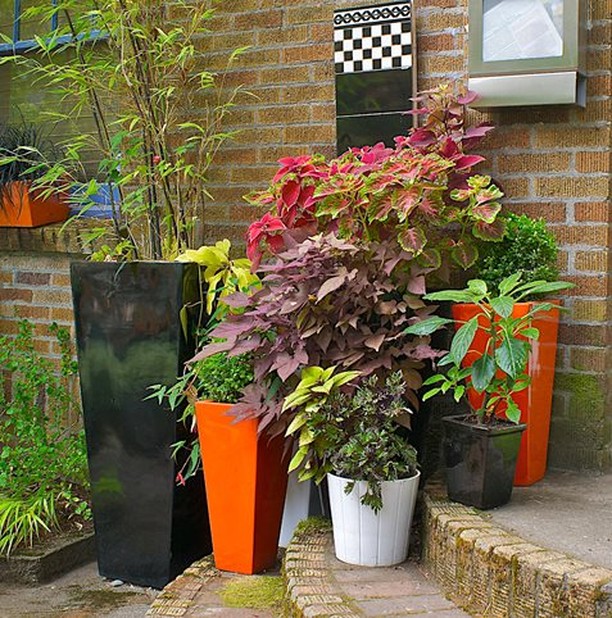 Have a shady spot in your garden or a dark area of a patio? Use brightly colored or shiny metal pots combined with lighter or contrasting hues of foliage and flowers.