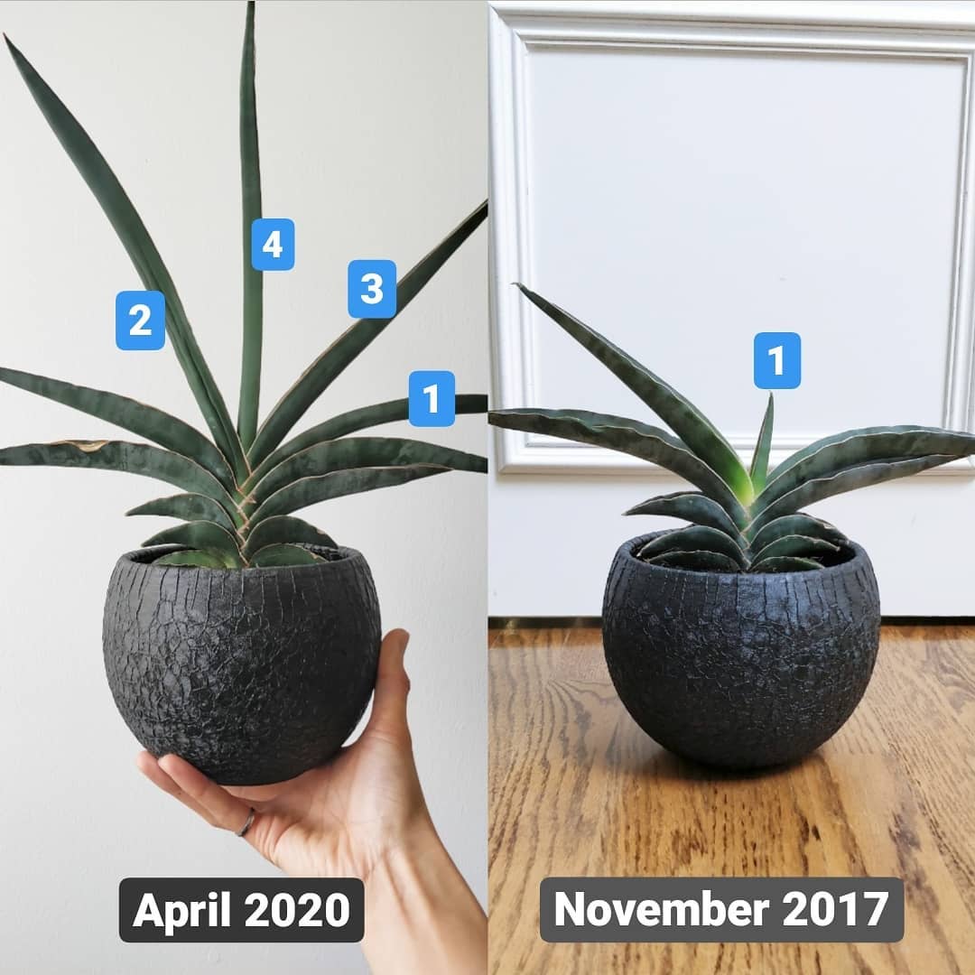 Sansevieria ‘Robusta Blue’ from November 2017 to April 2020: I observed 4 new leaves since I got the plant. I don’t have expectations on how many leaves should grow in x timeframe. I understand that leaves grown in my home conditions (200-400 foot-candles most of the day) will differ in shape because those grown at the nursery had different conditions (1000-5000 foot-candles most of the day). I just let Nature take its course.