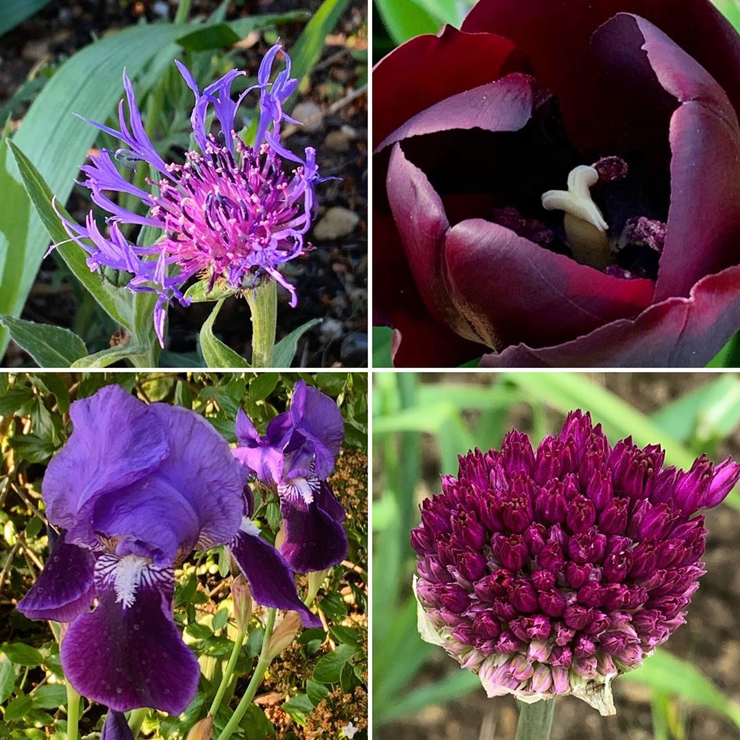 It’s National Gardening Week 👏🏼👏🏼👏🏼 So, GET OUT & GARDEN! Gardeners know how important gardening is to well being & mental health but we don’t do it for that – we do it because it’s fun & we love it! If you’re new to gardening then over the course of the week I’ll be posting some plant combinations to try with a little bit of info. Half the fun of gardening is in the planning so even if you can’t buy the plants at the moment you can dream of making a splash of colour when you can. The first is this one (although you’ll have to use delayed gratification as the Tulips & Allium are planted in the autumn). A combination for full sun on well drained soil. Clockwise from top left Centaurea montana, Tulipa ‘Queen of Night’, Allium ‘Purple Sensation’, Iris ‘Amas’ or similar (sorry – answers on a postcard for the specific variety). This will definitely give your garden some ‘ooomph’ in late April & May! Don’t forget to plant the Iris with the rhizomes on the surface so they can bake in the sun. That way you’ll get a good display of flowers. .