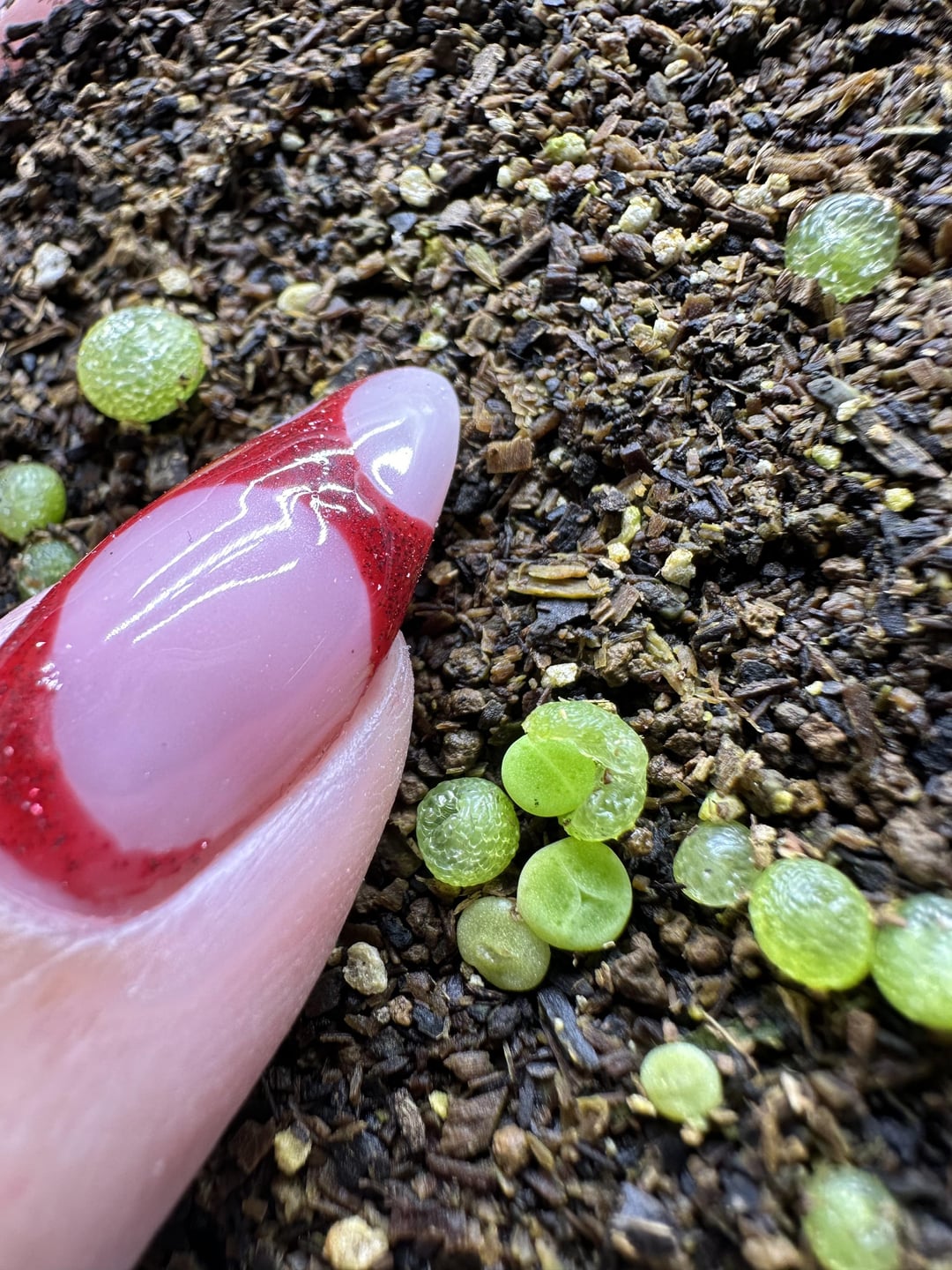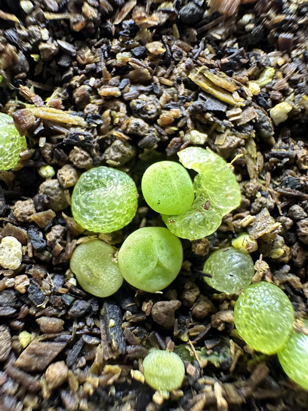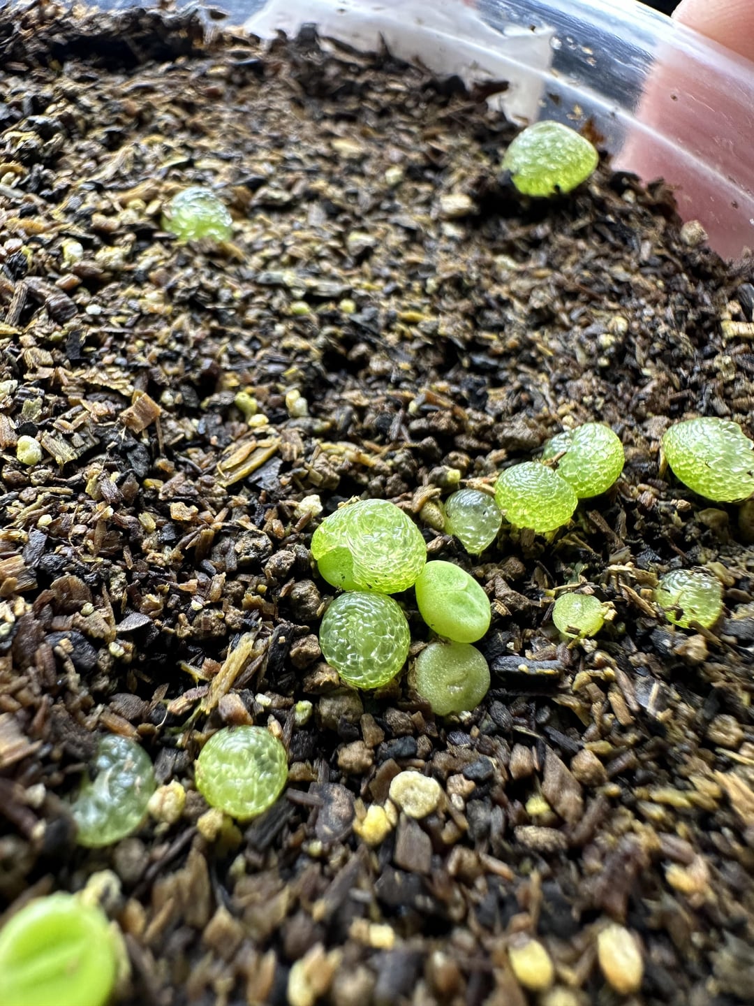 D. wilmotianus and D. vanzylii popping out of their cotyledons. One of my firsts from seed, not sure if 4 months is slow for them. I have a feeling they were stunted because of my terrible sowing method back then. Still good to see them tough it out! Thumb for scale, and yes you’re not supposed to peel off the cotyledon but I couldn’t help myself 🤷🏼♀️