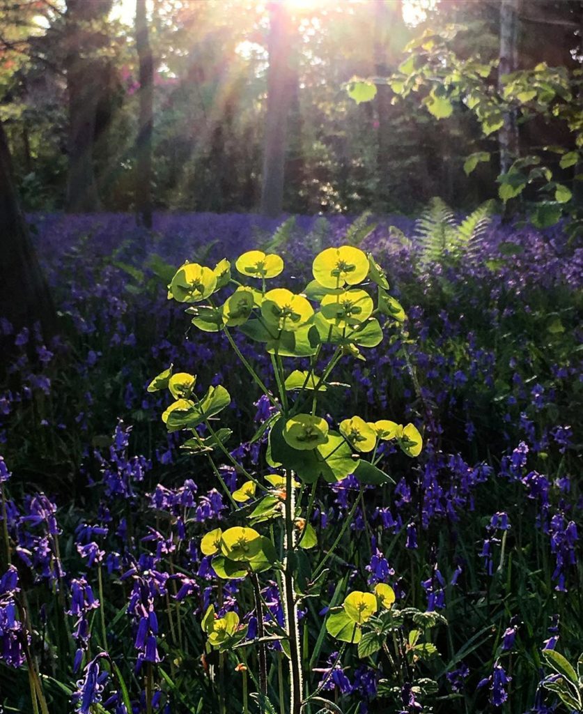 #one #lone #luminescent #lime #green Euphorbia in a #sea of #bluebells – #catching the last #rays of the #day. #Hats off to #mothernature’s #perfect #plant #combinations!