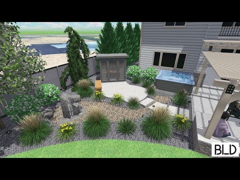 This backyard design includes a terraced ShadeWorks pergola, outdoor kitchen, fire pit, stepping stones to a sauna patio, a bubbler water feature and dry river bed, a shed/greenhouse with a deck and pergola, and perimeter plant material with year-round color.
