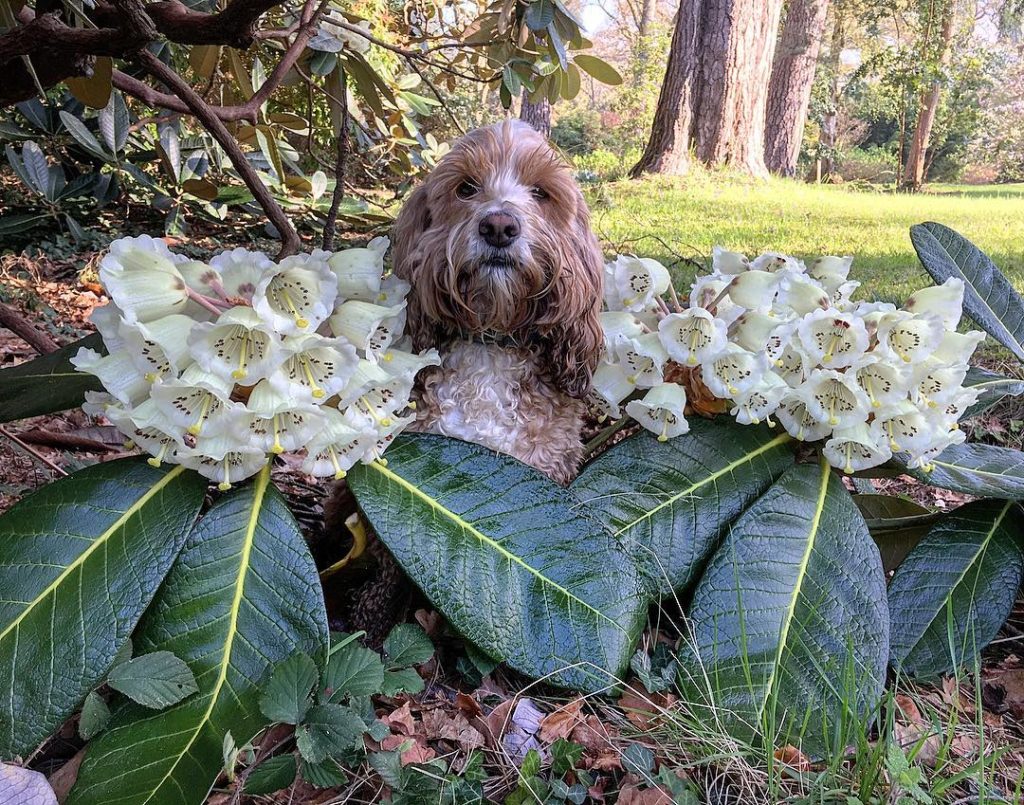 #pooch #scale #barometer – #Rhododendron ‘Fortune’ cultivar – Rh.Falconeri x Rh.Sinogrande and what a #result – epically huge #leaves and #flowers – as scaled relative to a #cockerpoo! Increasingly standard #horticultural sizing tool @exburygardens