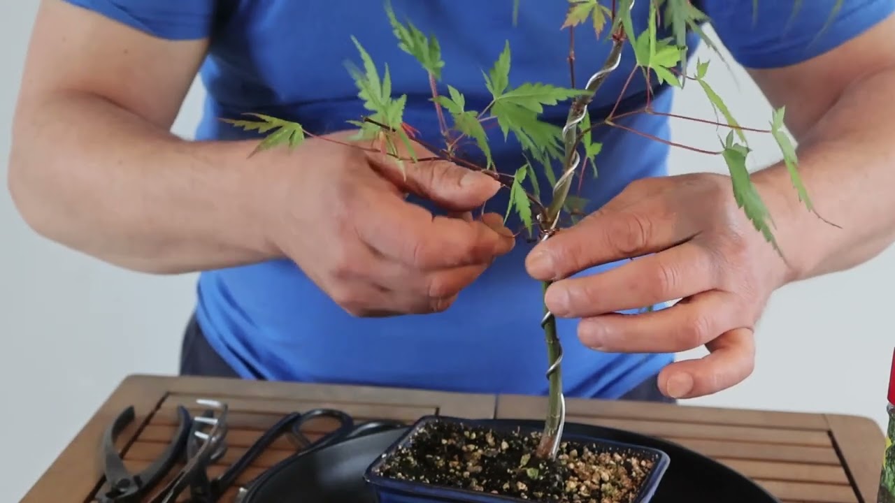 good morning welcome to gay Bonsai it’s the uh 14th of April 2024 uh today I’m going to just do a little bit of work on this uh Japanese maple I started this in uh February so I’ve made a couple of videos on it where it’s a 2-year-old um seedling tree I grew myself so what I did was pop it into this little blue Bonsai part and I put some water on the trunk and um then about a month ago I cut the growing tips out here and here to um encode some back budding and it’s back budded really nicely so I’m quite pleased with that right I’ll start with the wire I’ll use some very fine copper wire on this little Branch here so carefully unwire that and hopefully it’s h into position [Music] there so I’m quite pleased with how this has worked out so what I’m going to do for next year is definitely um start quite a few more off in the smaller Bonsai parts and then I hopefully I’ve got some larger ones I’ll have to get into sea trays and then what I can do do is get those um so they thicken the trunks up a bit more obviously the size of the pot uh dictates the size and the rate of growth of the tree as this is in quite a small pot it’s going to be quite slow grow sort of from now on but that’s um that’s what I wanted for this one so I should keep it in this similar size Bonsai part and then we’ll try carefully I don’t think I’m going to do more wiring on it this year or at least not until the Autumn so we’ll see if we can unwire it without knocking anything off I’ve got some little wire cutters but I like to reuse the wire as possible I can see it’s just starting to right into the trunk very slightly there so that’s ideal time to get that off the tiny little wi marks there it seems to have H it oh has quite there we are so I’ve got a tiny little bit of wire marking on there hopefully that will grow out I might leave any visible scars on the trunk but uh as I’m learning as I’m going here it’s kept the uh shape nicely as well so that’s the Japanese maple the wi was just started to bite in there so I’ve taken it off at just the right time so that’s all looking good [Music]