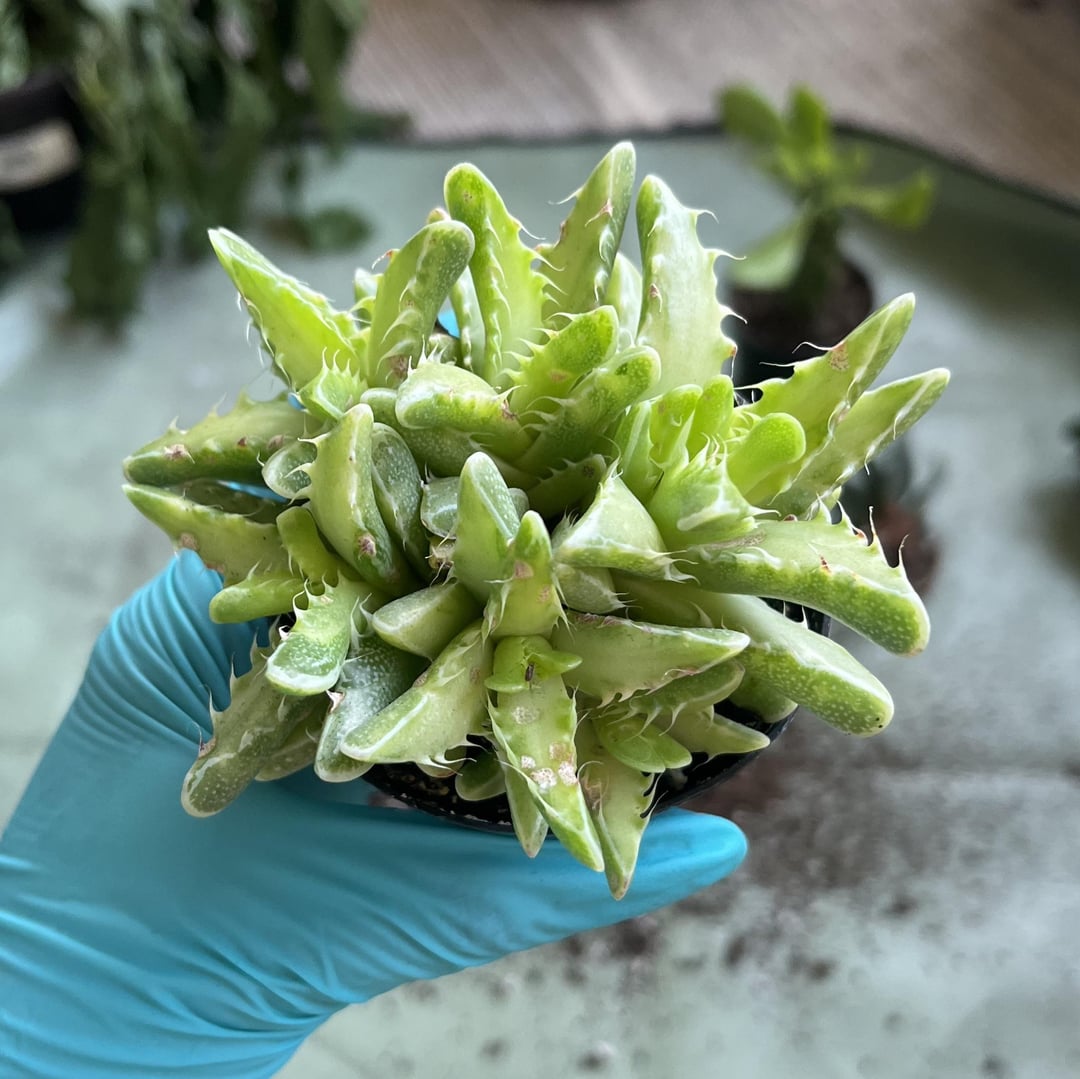 i’ve only bought mine from occasionally finding them at big box stores (mostly home depot and lowe’s), but a lot of them end up being too far gone and rotting from the inside 🙁 this variegated faucaria tigrina was one of them.