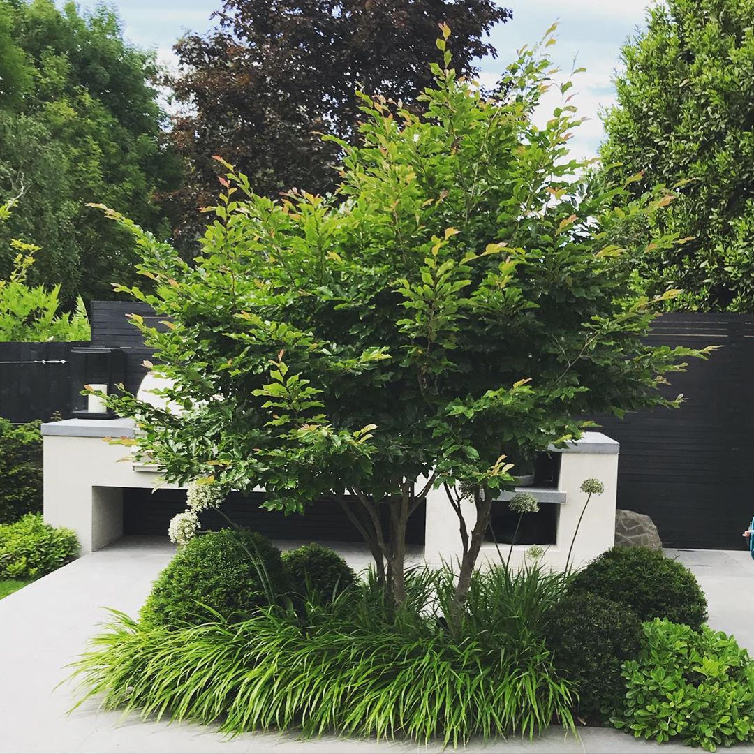 Beautiful #parrotiapersica multi-stem #tree on the terrace of one of our #gardens in #southeast #london underplanted with Taxus and #hakonechloa
