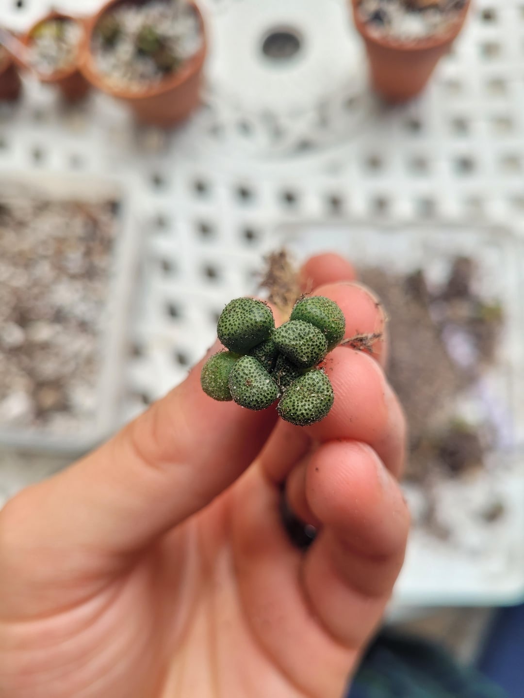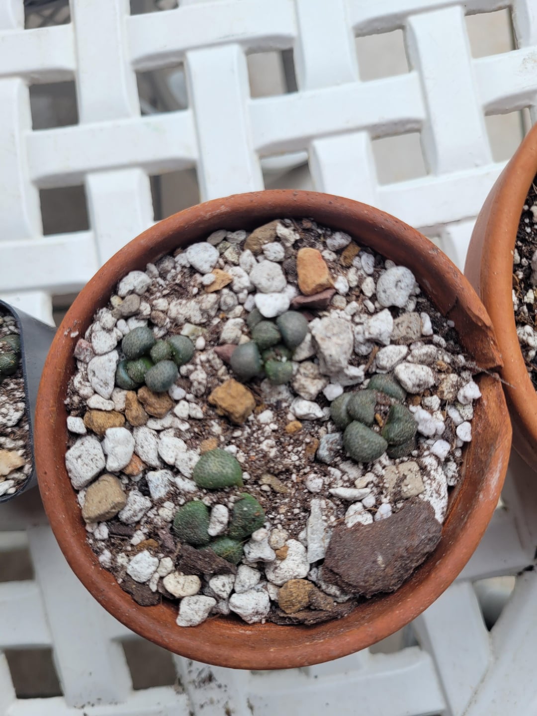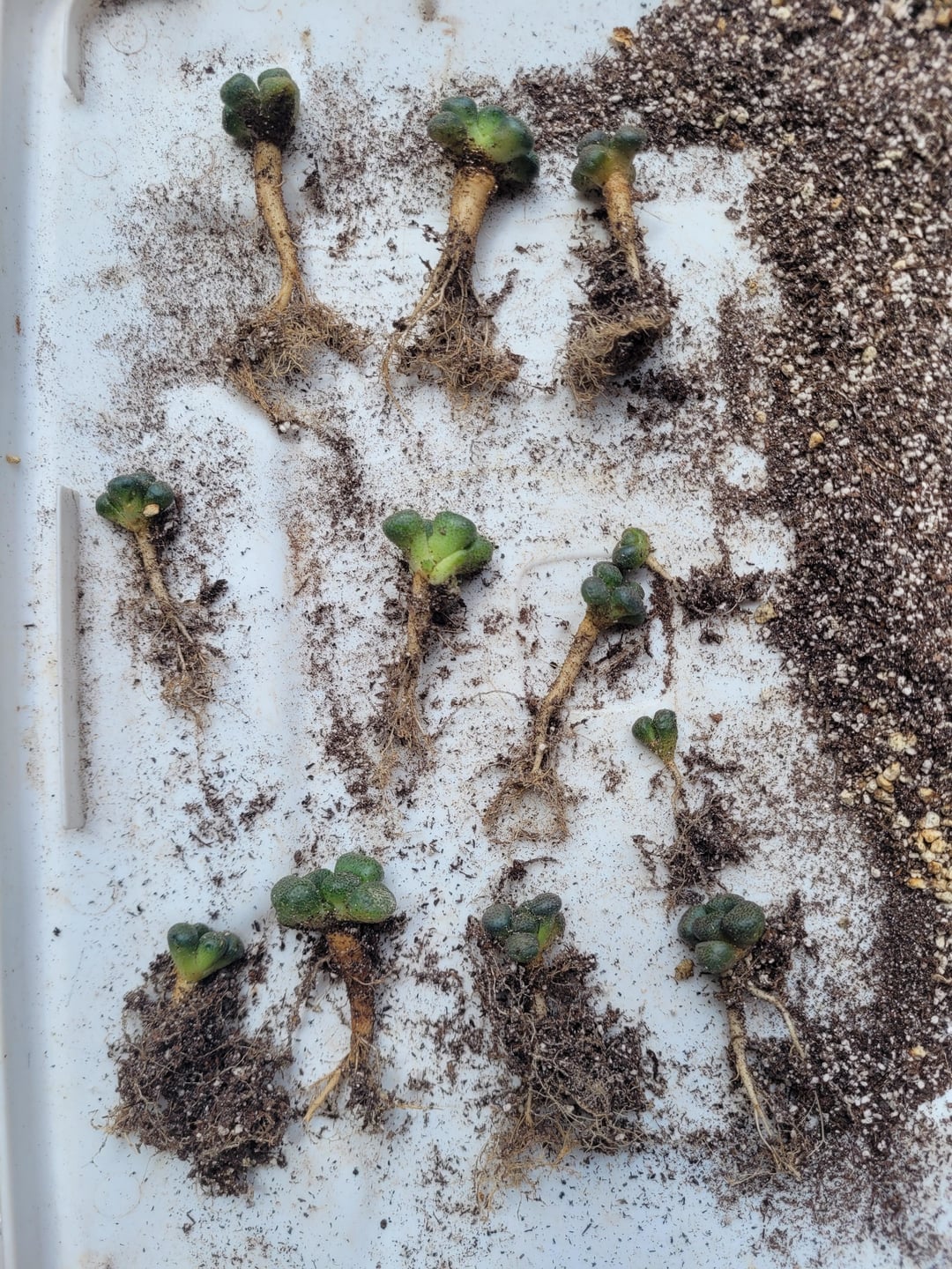 I needed to space out my five month old seedlings and decided today was the day. They had begun to grow on top of each other which wasn't good. Moved them into a more gritty mix in three separate pots as I hope to avoid having to repot again for a while. Gave them a light misting to help them settle. Love the size of these tap roots!