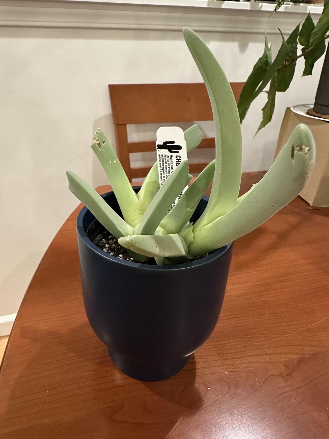 Help me make a plan for this one to thrive or umm, survive with pride š¤£? I am confident with a lot of plants though I have to admit my track record in the succulent genre isnāt stellar. Iāll repot with sandy/ rocky/ good draining soil. Iām stuck on this color combo so itās not getting an unglazed pot. Iāve done some reading about care but it was less than confidence inspiring. Soil was lightly damp when I brought home from nursery. Itās dry dry now. When should I water? like a month? Really? Itās getting solid afternoon and evening light in a window. also whatās going on with the wrinkling on the one piece (second photo)? it is just sending water to future growth or upset about something that happened before I got it? TIA!