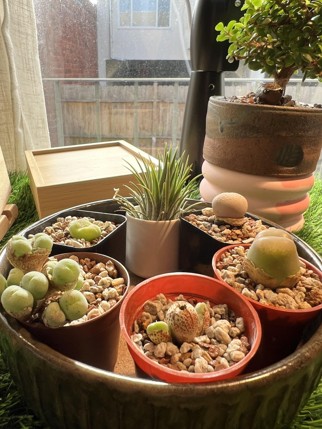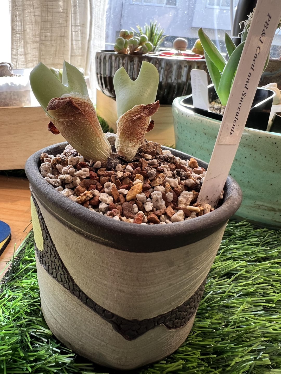 I got these cuties at my town’s Succulent Society Expo two months ago (where I was super-lucky and met Steven Hammer himself!). I repotted them into gritty mix recently, and they live on my desk against an east facing sliding glass door. I have a curtain that blocks around 25% of the sunlight for those rare days when it’s too bright or hot in zone 10b, where I live. I’ve (bottom) watered twice since I got them, and they are definitely outgrowing their papery skins! I thought I’d start watering weekly starting now. Does this all sound reasonable? Should I be doing something more? Your thoughts and recommendations are appreciated. Thank you!