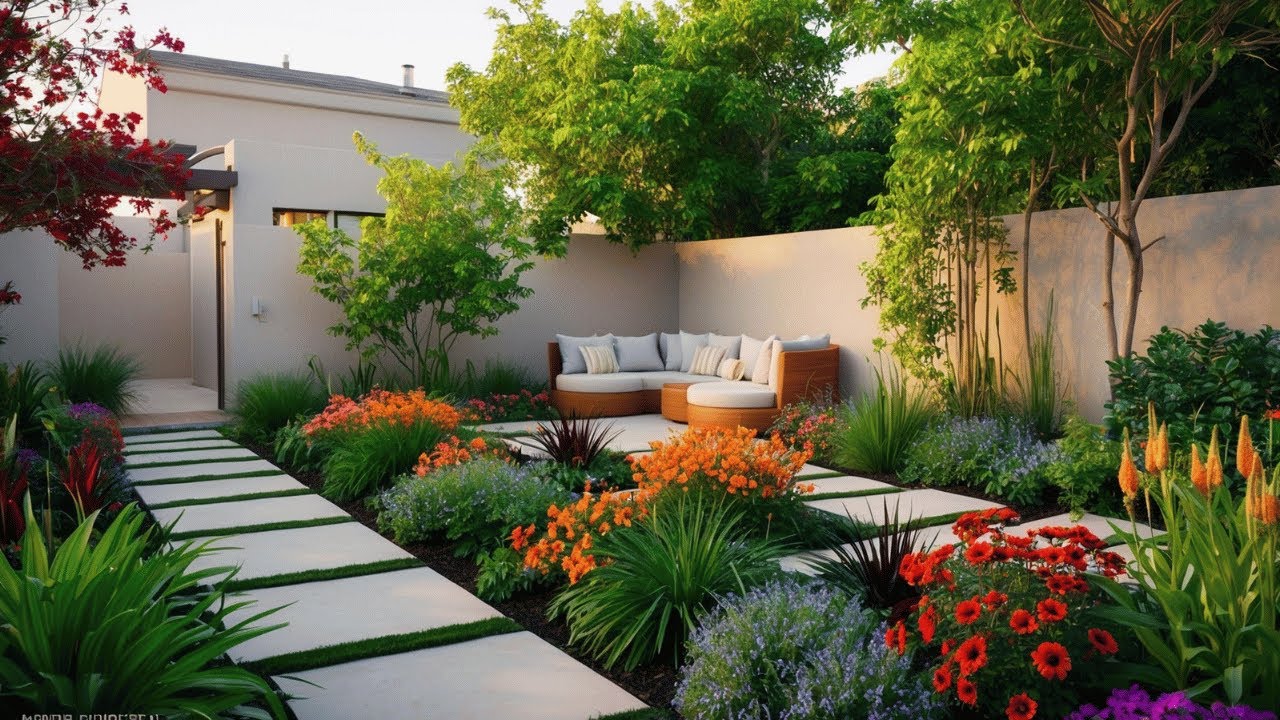 #GardenDesign #MinimalistLandscape #FrontyardIdeas #SmallGarden #PathwayDesign #SeatingArea #OutdoorLiving #Greenery #GardenLighting #DecorativeElements
