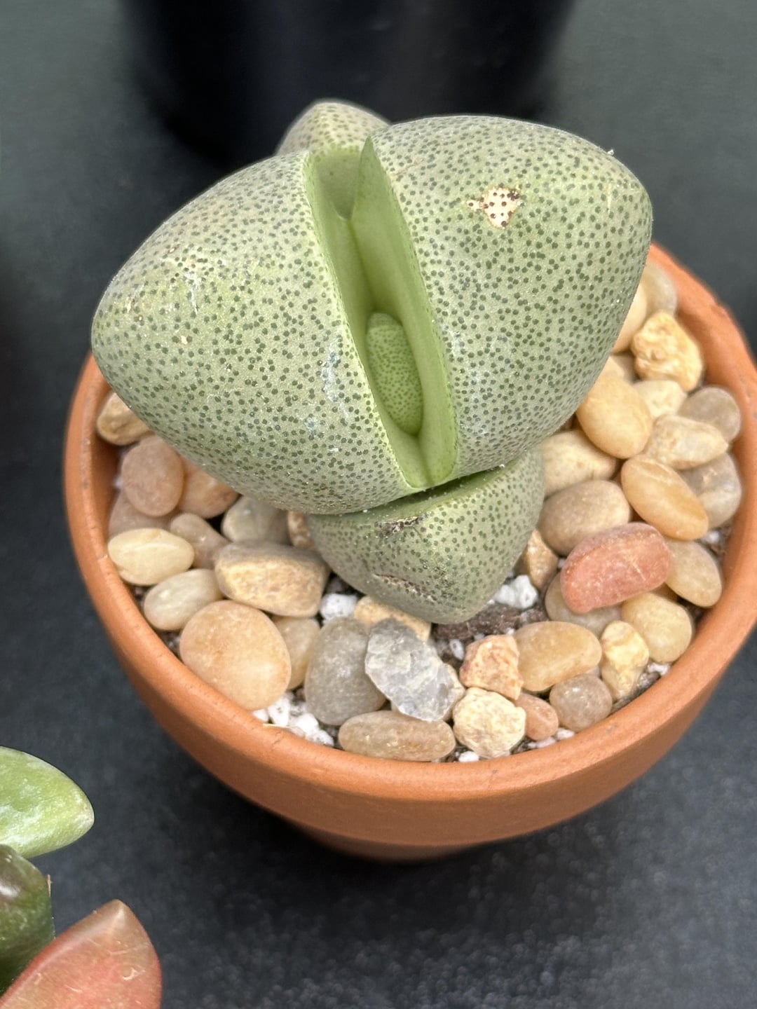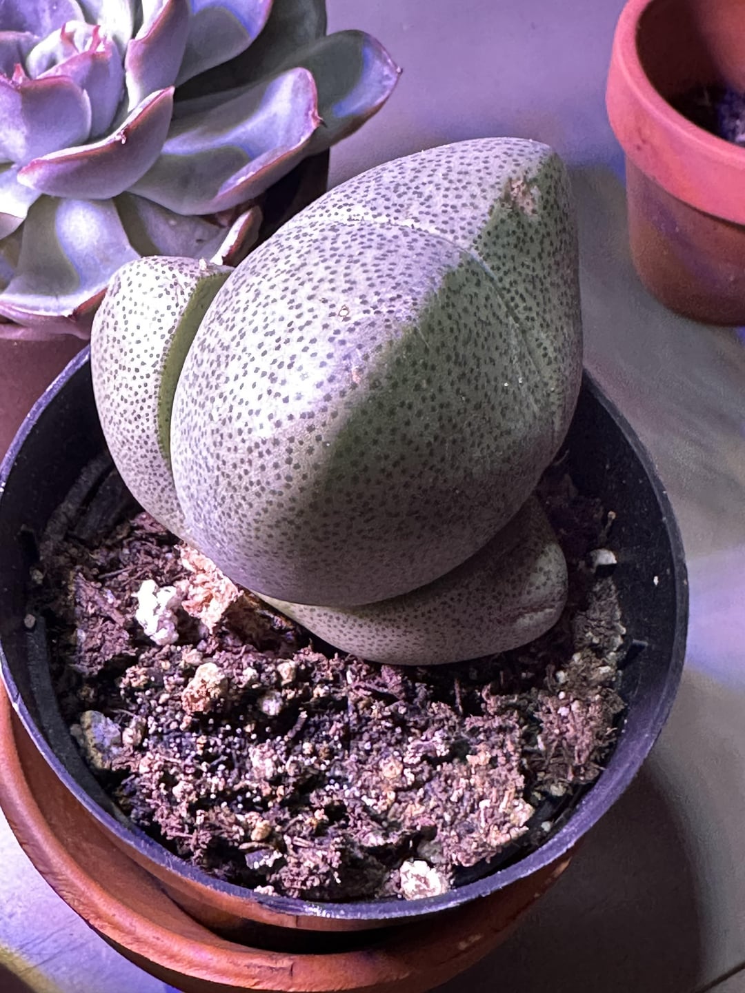 I bought this pleiospilos nelii on August 1 – three weeks ago. The top leaf pair was closed. I repotted into a mix of perlite and cactus soil about two weeks ago. I have not watered it at all. The upper and lower leaves are still firm. I was surprised to see the upper leaves opening to reveal a new leaf. I read that watering could trigger leaf stacking, multiple leaves open at a time, but this is happening without watering.