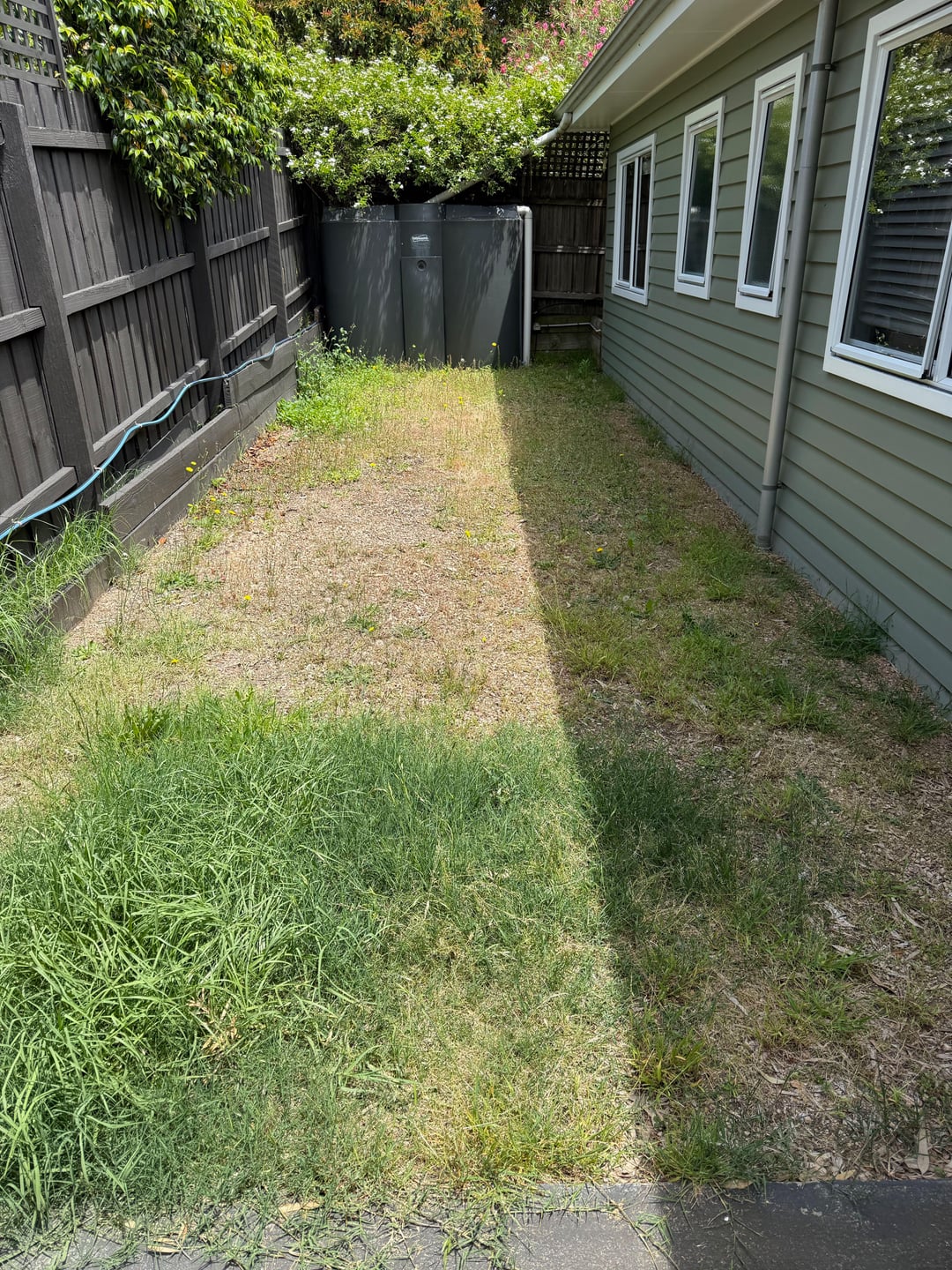We have a long narrow south-facing side yard (15m x 3.3m) off the side of our house. It has very shallow, stony topsoil (about 6cm) over a weed mat. The weeds have come through everywhere and it’s hard to manage. I think the soil underneath is clay.